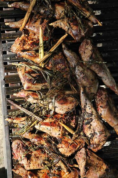 Die Hasenkeulen mit Salz und Pfeffer würzen und mit Sonnenblumenöl einreiben. Zusammen mit den Knoblauchzehen, den Zitronengrasstängeln sowie den Thymian- und Rosmarinzweigen in der Nähe des Feuers platzieren oder bei mittlerer Hitze (ca. 180 °C) indirekt grillen, bis sie eine goldbraune Farbe angenommen haben. Das dauert ungefähr 3 Stunden. Anschließend die Hasenkeulen vom Rost nehmen, das Fleisch von den Knochen entfernen und in 1 cm große Würfel schneiden. Die Fleischwürfel in einen Dutch Oven geben und zusammen mit der BBQ-Sauce, der Butter und dem Wildfond aufkochen. Für 60 Minuten mit geschlossenem Deckel und wenig Hitze simmern lassen und anschließend servieren.