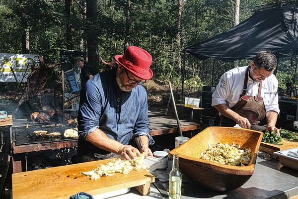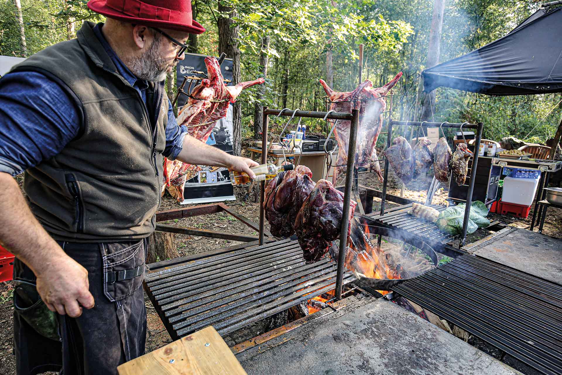 Rob würzt die Damwild- und Wildschwein-Keulen vor dem Grillen nur mit etwas Salz und Pfeffer und lässt sie dann in der Nähe des offenen Feuers mit nicht zu viel Hitze langsam für etwa sechs Stunden garen. Dabei ist das Aufhängen an den stabilen Haken sehr praktisch, da sich die Keulen so ab und zu wenden lassen, um rundherum gleichmäßig zu garen. Wer sich zu Hause an einer Wildkeule versuchen will, kann diesen Effekt natürlich gut mit einem Drehspieß erzeugen. Für den aromatischen Extrakick gibt Rob Pflaumenschnaps auf das Damwildfleisch.