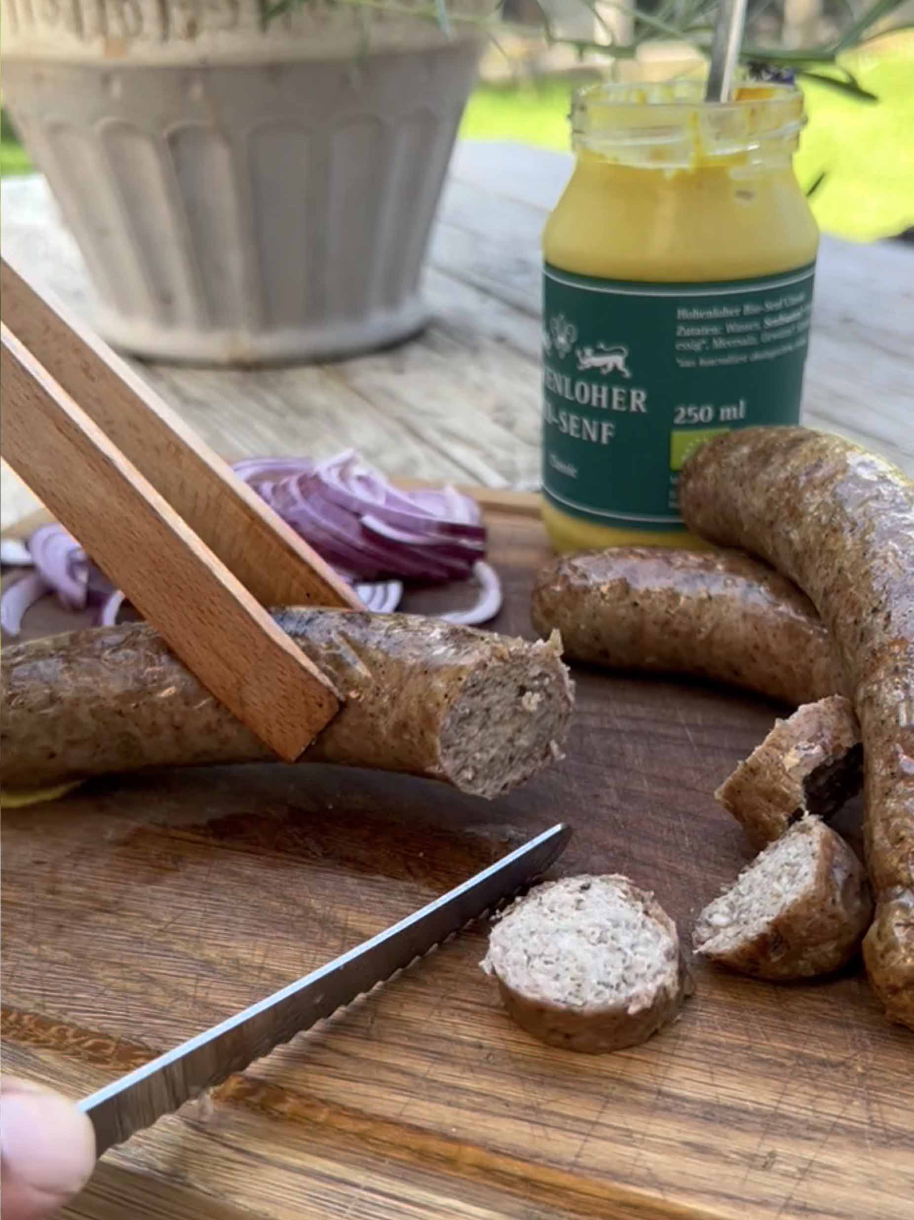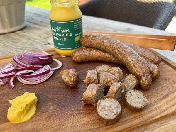 Die gebrühte Wildgrillwurst im Schweinenaturdarm besteht aus 58% heimischem Wildfleisch (Reh und Wildschwein). Weitere Zutaten sind Schweinefett, Schweinefleisch (7%), Trinkwasser, Steinsalz und Gewürze aus kontrolliert ökologischem Anbau (1,4%). Die einmalige Rezeptur wurde exklusiv für DIE HUBERT entwickelt. Probieren Sie die leckere Wildgrillwurst direkt auf der Messe vom 16.-18. September auf dem albgut in Münsingen, und kaufen Sie gerne vor Ort einen Vorrat für Ihren Grill zuhause. Der Geschmack wird Sie überzeugen! Außerdem unterstützen Sie mit dem Kauf die Bäuerliche Erzeugergemeinschaft aus der Region.